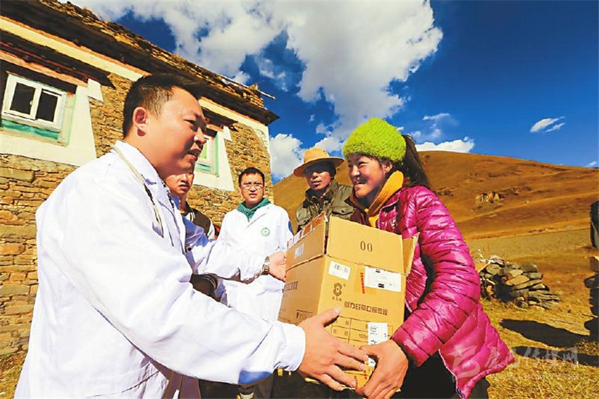 右圖:2016年11月2日,遂寧市中心醫(yī)院派駐康定市人民醫(yī)院的城鄉(xiāng)醫(yī)療對口支援醫(yī)療隊(duì),深入新都橋鎮(zhèn)呷巴鄉(xiāng)自弄村特困戶彭措拉姆(右一)家義診,并向她捐贈(zèng)了衣物。 (資料圖片)