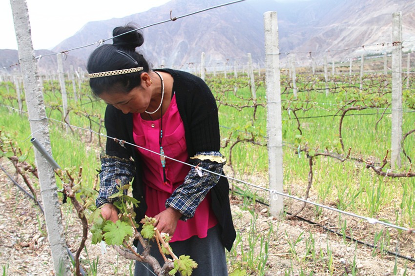 四郎吉村地處半山腰,干旱缺水、土地貧瘠,村民們以前都靠種植青稞來獲得收入?!斑^去,由于缺技術(shù)、葡萄的品質(zhì)不高,我家種的釀酒葡萄賣不出去;現(xiàn)在,太陽魂公司承包了村民們的葡萄園,成立專業(yè)合作社,統(tǒng)一種植、統(tǒng)一管理、統(tǒng)一經(jīng)營,既規(guī)避了風險,又為大家?guī)砹撕芎玫慕?jīng)濟效益?!睂τ诖迕袢是嘀粳攣碚f,生活的好轉(zhuǎn)都起因于小小的葡萄。