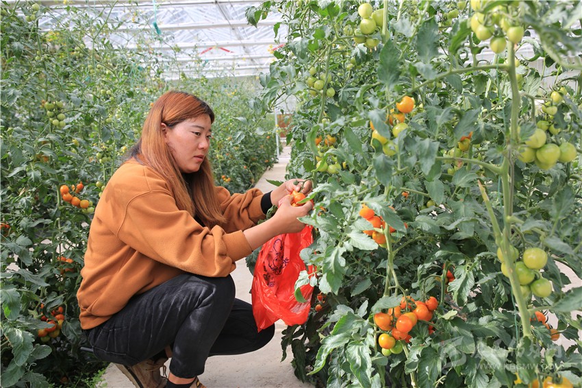 記者來到產(chǎn)業(yè)園的智能溫室大棚,只見里面各種紅的黃的綠的、大的小的番茄,掛滿藤蔓。“基地以種植綠色無公害農(nóng)產(chǎn)品為主,這是我們今年開始試種的小番茄,有十來個品種,你別看它還是綠色的,其實已經(jīng)成熟了?!庇浾呓舆^孟凡強摘下的幾個小番茄,一口咬下,香甜多汁且沁人心脾。孟凡強介紹,這是他們與北京神州綠鵬農(nóng)業(yè)科技有限公司合作,精選引進中國航天工程育種的優(yōu)質(zhì)品種。除了番茄,溫室內(nèi)還種有秋葵、辣椒、小葫蘆、僧帽瓜等蔬菜,處處綠意盎然。