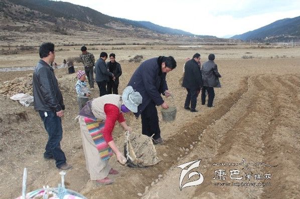在格中村的田間地頭,到處是一片忙碌的春播景象。雷建平走進(jìn)斯朗卓瑪?shù)奶镩g,在農(nóng)業(yè)技術(shù)人員的指導(dǎo)下,從選種開始學(xué)起,病害的種丟掉、大的切成幾瓣,撒點(diǎn)底肥,均勻丟種,把蓋種的土弄成一個(gè)梯形的壟。雷建平一邊勞動(dòng),一邊和斯朗卓瑪攀談,去年土豆收成怎樣?有沒有增加收入?今年春耕生產(chǎn)有哪些實(shí)際困難?雷建平又接著向她推薦用地膜種土豆的好處,蓋不蓋膜大不一樣,1畝要多收500-1000公斤,加上上市早,價(jià)格也要貴一些,可以到臨近的甲洼鄉(xiāng)江達(dá)村去學(xué)習(xí)經(jīng)驗(yàn)。