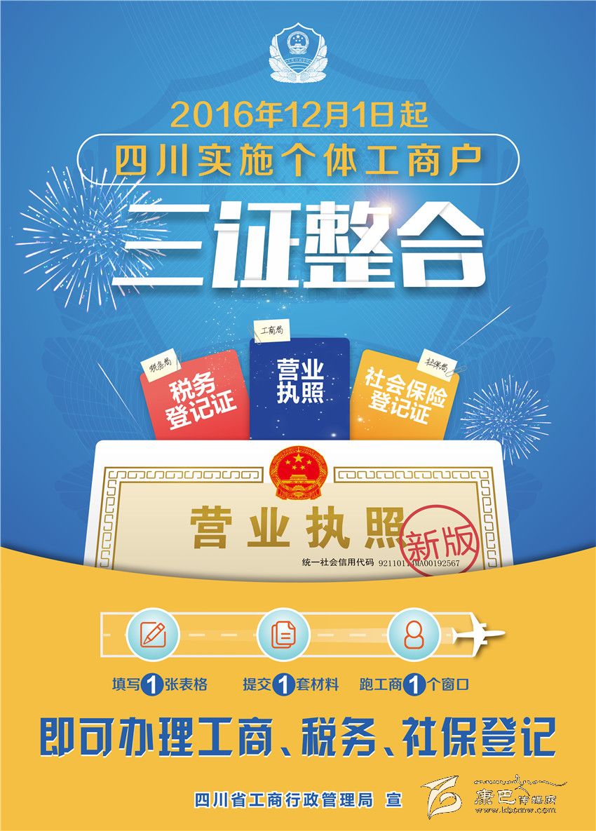 本網(wǎng)訊(局辦)為進(jìn)一步深化商事制度改革,加快推進(jìn)“五證合一”登記制度改革向個(gè)體工商戶延伸,經(jīng)研究,從2016年12月1日起,在全國(guó)統(tǒng)一部署“兩證整合”的基礎(chǔ)上,我省全面實(shí)施個(gè)體工商戶營(yíng)業(yè)執(zhí)照、稅務(wù)登記證和社會(huì)保險(xiǎn)登記證“三證整合”。