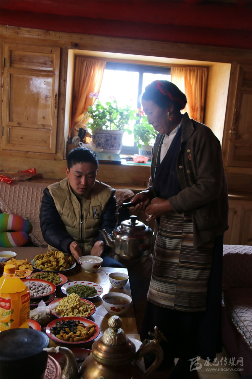 離開(kāi)合作社,記者一行受邀前往村支部書(shū)記澤吉家里做客。汽車(chē)在整潔的入戶公路上行駛一陣后,一棟外觀精巧、色彩繽紛的寬大全木質(zhì)民居出現(xiàn)在記者眼前。走進(jìn)客廳,幾張擺滿了各種水果、飲料、干果、糖、酥油果子的藏桌引起了記者的注意,一位十來(lái)歲的女孩正在觀看藏歷新年春晚。看到有客上門(mén),澤吉的愛(ài)人立刻端來(lái)了熱騰騰的酥油茶和黃澄澄的青稞酒。
