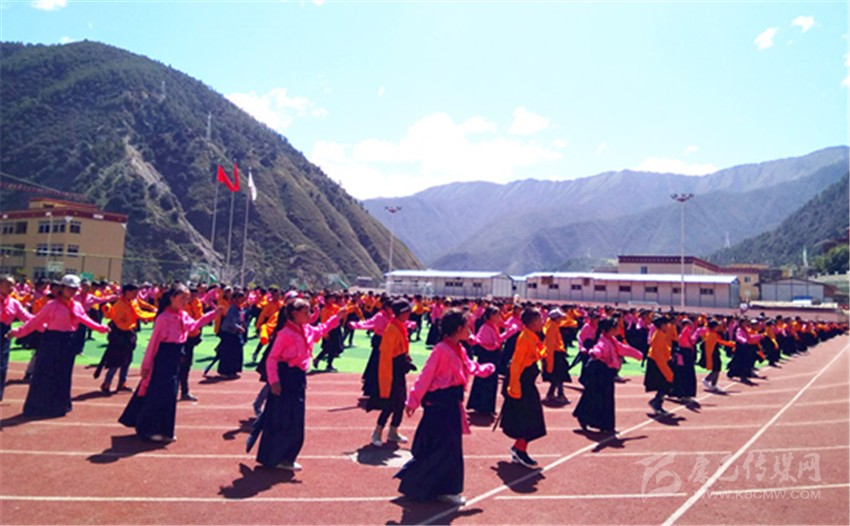 在雅江縣呷拉教育園區(qū),學(xué)生們?cè)诓賵?chǎng)跳課間舞。