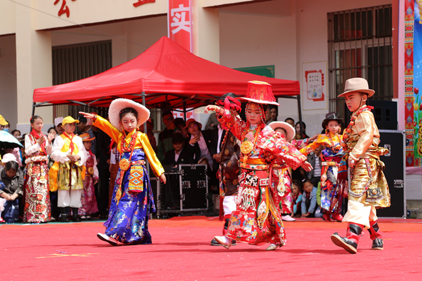 在縣城小,孩子們隨著民族音樂特有的旋律舞動身姿,踏著歡樂的舞步跳起鍋莊,讓人仿佛置身于大草原。孩子們還穿著各式各樣的藏式民族服裝進行了一場服飾秀表演。