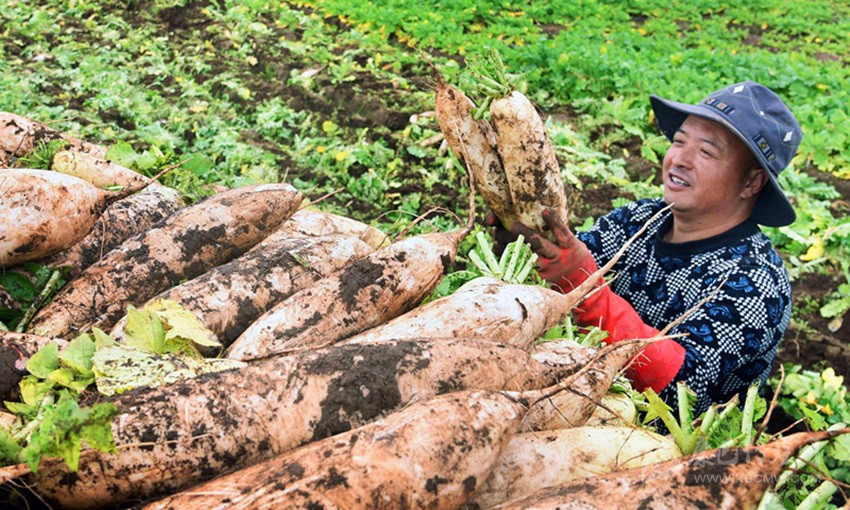 2018年12月22日,在海拔3600米的理塘縣濯桑鄉(xiāng)康藏陽光蔬菜生產(chǎn)加工基地,村民們正在采收水果蘿卜。這批水果蘿卜將遠(yuǎn)銷港澳市場。水果蘿卜在香港的零售價(jià)是每公斤20港元,約合人民幣17元多。