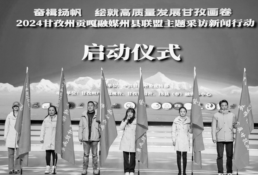 本網(wǎng)訊 為著力建設(shè)習(xí)近平文化思想涉藏地區(qū)生動實踐地的“甘孜樣板”,奮力打造中華文明和康巴文化傳播的“甘孜窗口”,努力創(chuàng)造宣傳思想文化工作的“甘孜品牌”,2月28日,以“奮楫揚(yáng)帆 繪就高質(zhì)量發(fā)展甘孜畫卷”為主題的甘孜州貢嘎融媒州縣聯(lián)盟主題采訪新聞行動在州廣播電視臺文藝演播大廳啟動,一場圍繞中心、服務(wù)大局的新聞實踐,分批推進(jìn)、貫穿全年的統(tǒng)一行動,新聞戰(zhàn)線協(xié)同聯(lián)動、各展其長的創(chuàng)新探索至此拉開帷幕。