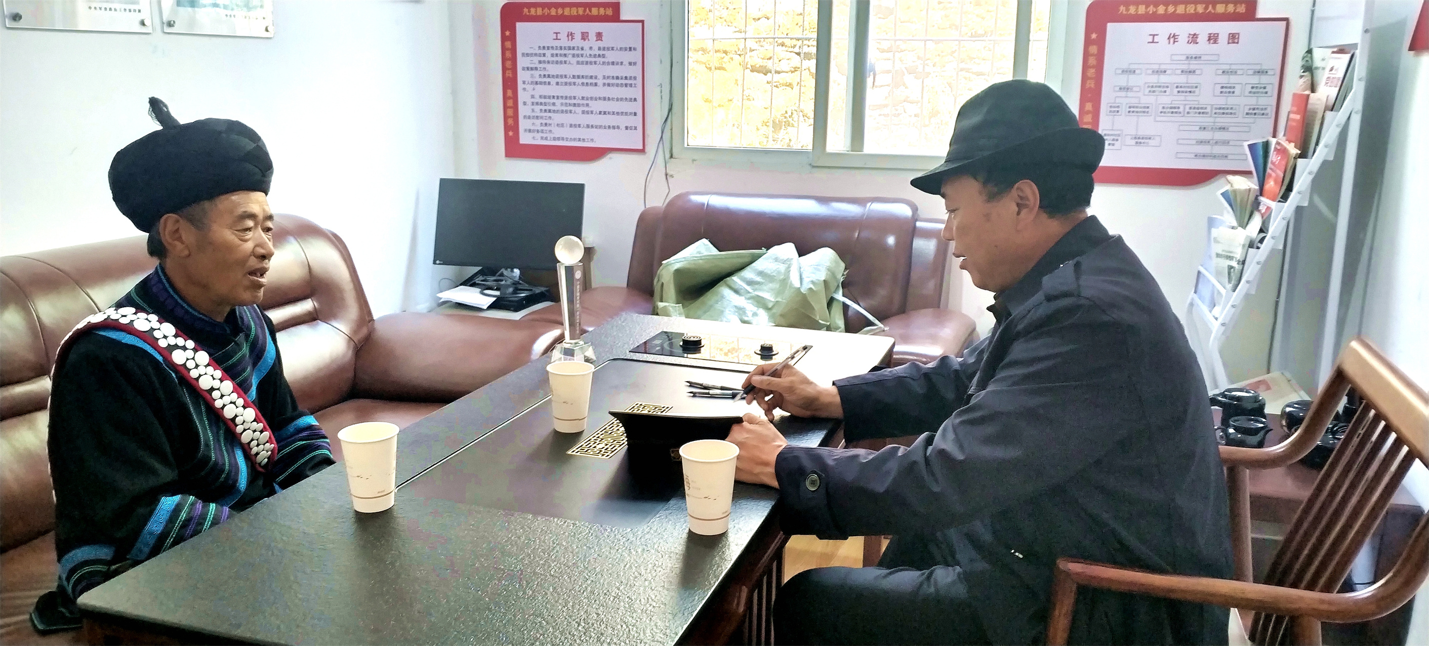 圖為烏尼比秀(中)正在調(diào)解鄰里糾紛。