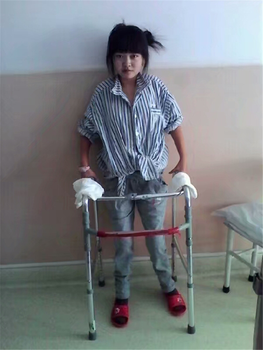 23歲時,深圳的楊先生爽快地幫助朱靈湊夠了手術(shù)費用。2013年9月,朱靈在親人的護送下,到北京接受了手術(shù)治療,手術(shù)很成功。但做牽引、吊腿、揉搓、重壓等康復訓練,如遭酷刑,萬般痛苦,她曾想放棄。在病友和親屬的鼓勵下,她倚墻靠壁,憑借器具,大汗淋漓,通過一個多月的康復鍛煉,朱靈終于站了起來。