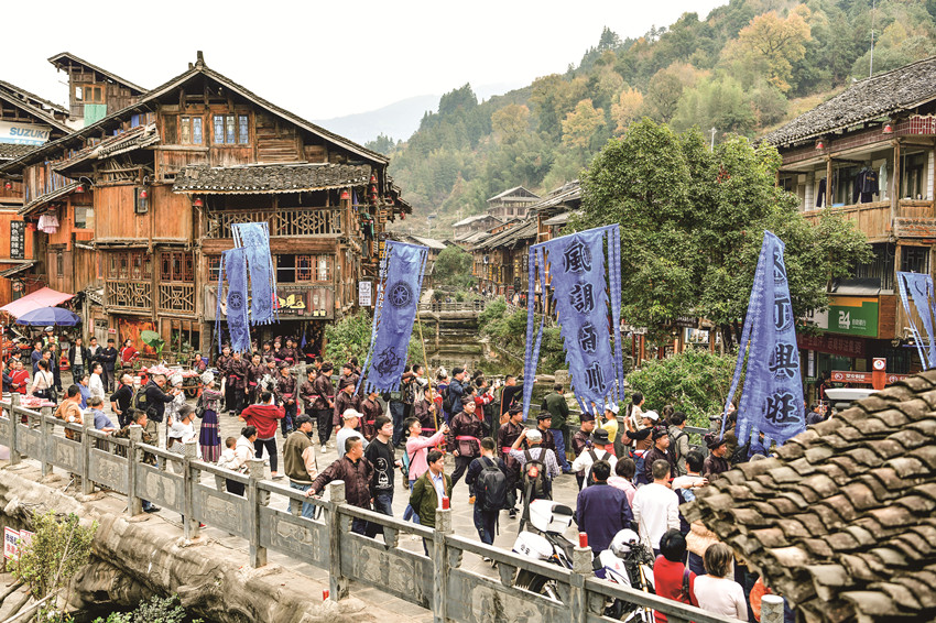 在貴州省黎平縣肇興侗寨,侗族群眾身穿節(jié)日盛裝參加侗年活動(dòng)。