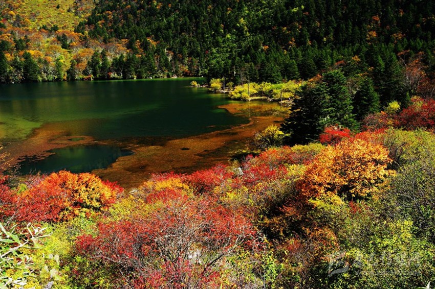 月牙形的七色海猶如一面五光十色的鏡片,鑲嵌在森林與草坪之間。叢林中百鳥輕歌曼舞,湖岸坪清幽秀雅,湖中水草飄逸,羌活魚在水底卵石中悠游,蕩舟穿霧興波,湖光山色眼底。環(huán)湖覽勝,“蓮花霧繞”、“蓮花夕照”、“駝峰倒影”等佳景襯托出七色海自然的靈趣,更兼那四時(shí)陽(yáng)光雨霧變化莫測(cè),湖水呈現(xiàn)赤、橙、黃、綠、青、藍(lán)、紫多種色彩的奇觀,堪稱湖景一絕。