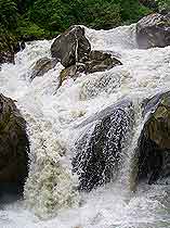 溝外交通與燕子溝大致相同,從南門關溝至兩河口14.5千米,在這里分做兩條路,一條往西南去牛園子和冰川,一條往西北去蟲草棚子(二號營地)和冰川。這里沒有食宿,道路艱險,馬不能通行,需要當?shù)叵驅А?/p>